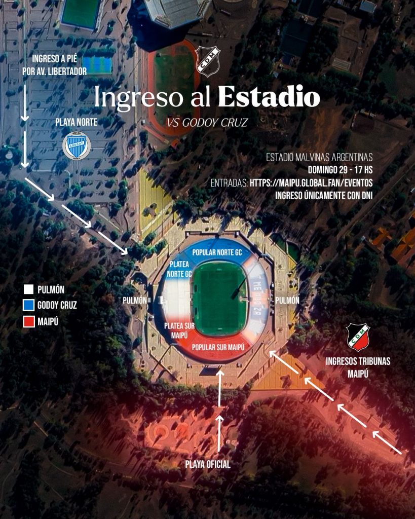 En cuanto a la ubicación, la parcialidad de Godoy Cruz se ubicará en el sector norte del estadio, con acceso a la Popular Norte y Platea Norte. Además, estará habilitada la Playa Norte para estacionamiento. Los ingresos a estos sectores se realizarán exclusivamente por Avenida Libertador.
